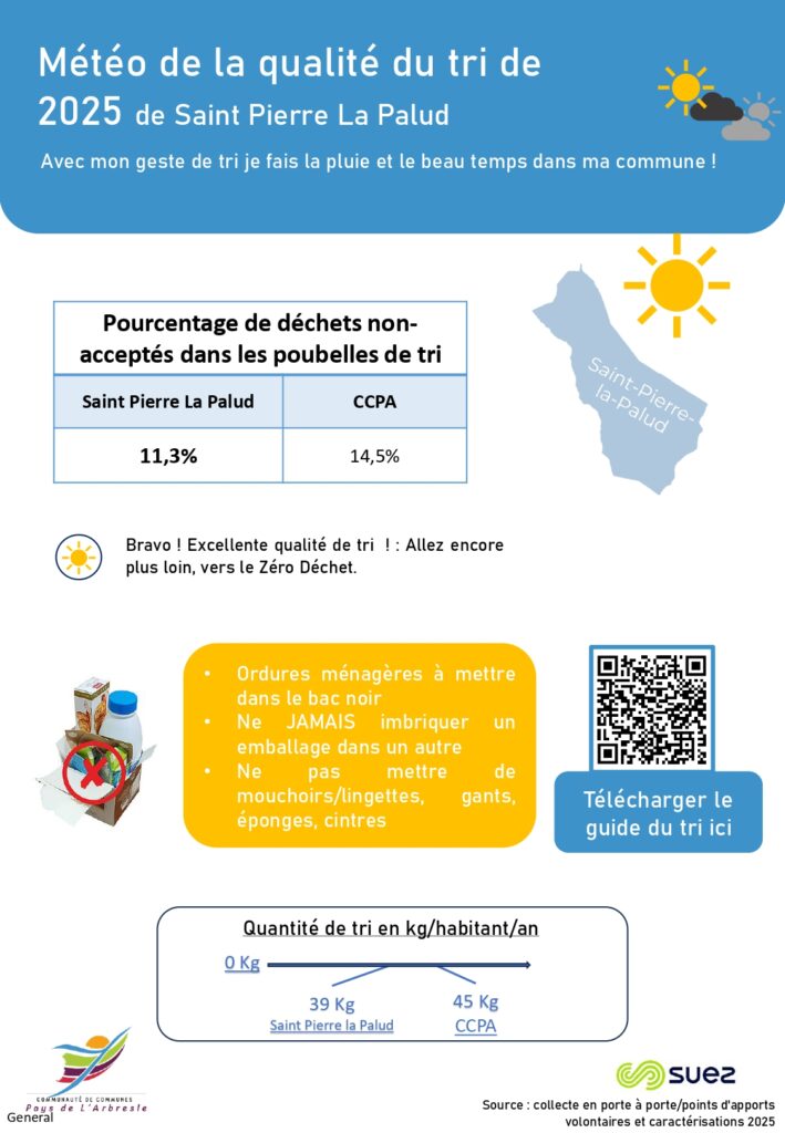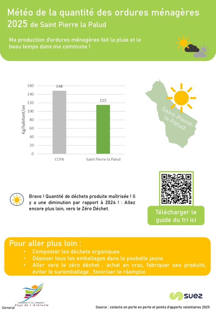 La commune maintient une production de dĂ©chets maĂ®trisĂ©e sur le deuxième semestre 2025, avec un niveau infĂ©rieur Ă  la moyenne de la CCPA. La quantitĂ© d’ordures mĂ©nagères est Ă©galement en baisse par rapport Ă  l’annĂ©e 2024 đ꓉